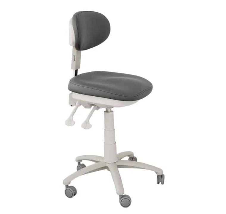 Taburete ergonómico de diseño elegante con respaldo envolvente y asiento tipo silla de montar, pensado para ofrecer máxima comodidad durante largas jornadas de trabajo. Equipado con tres palancas que permiten regular la altura, la inclinación del respaldo y del asiento con precisión.